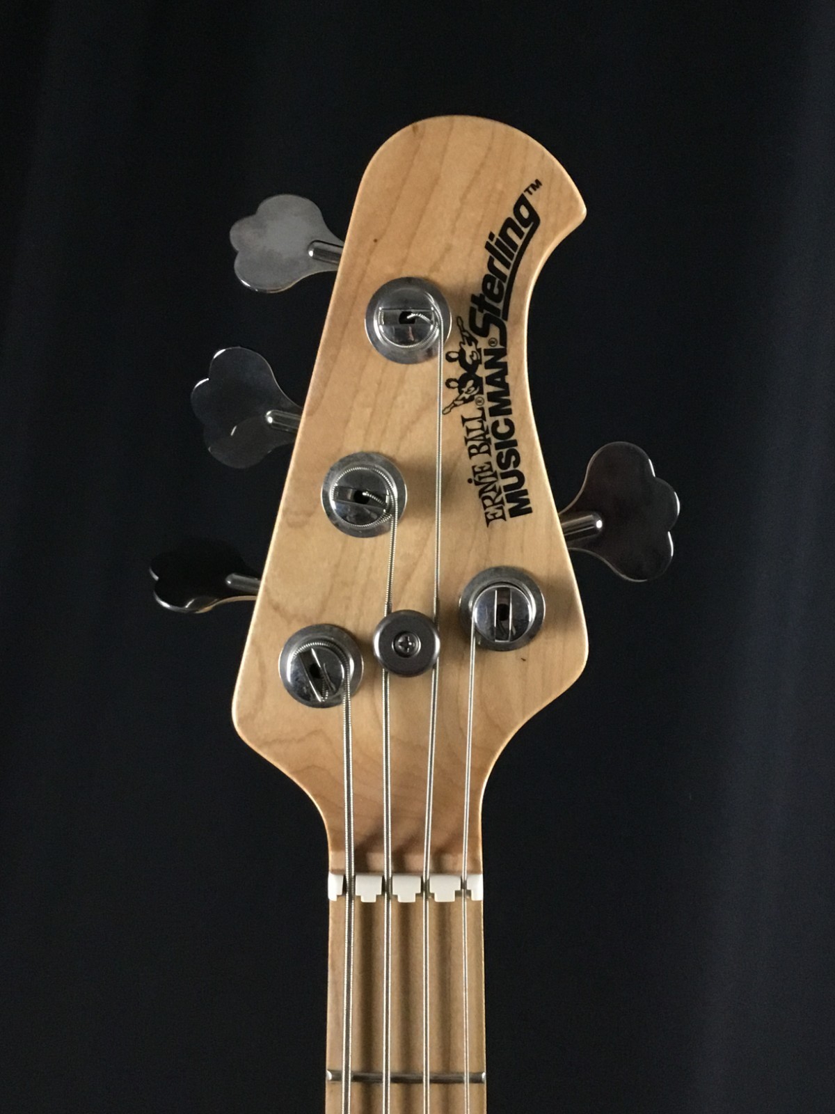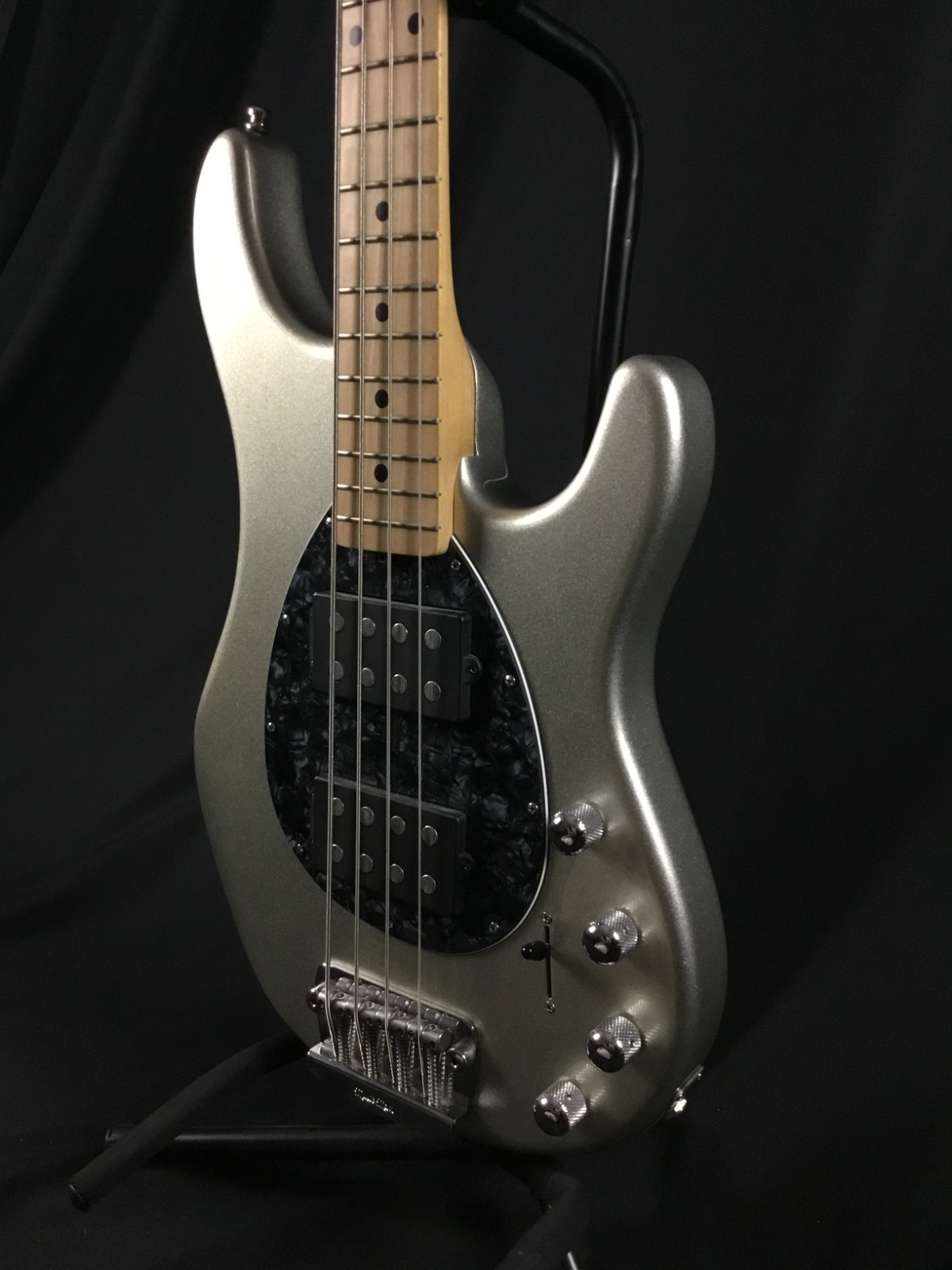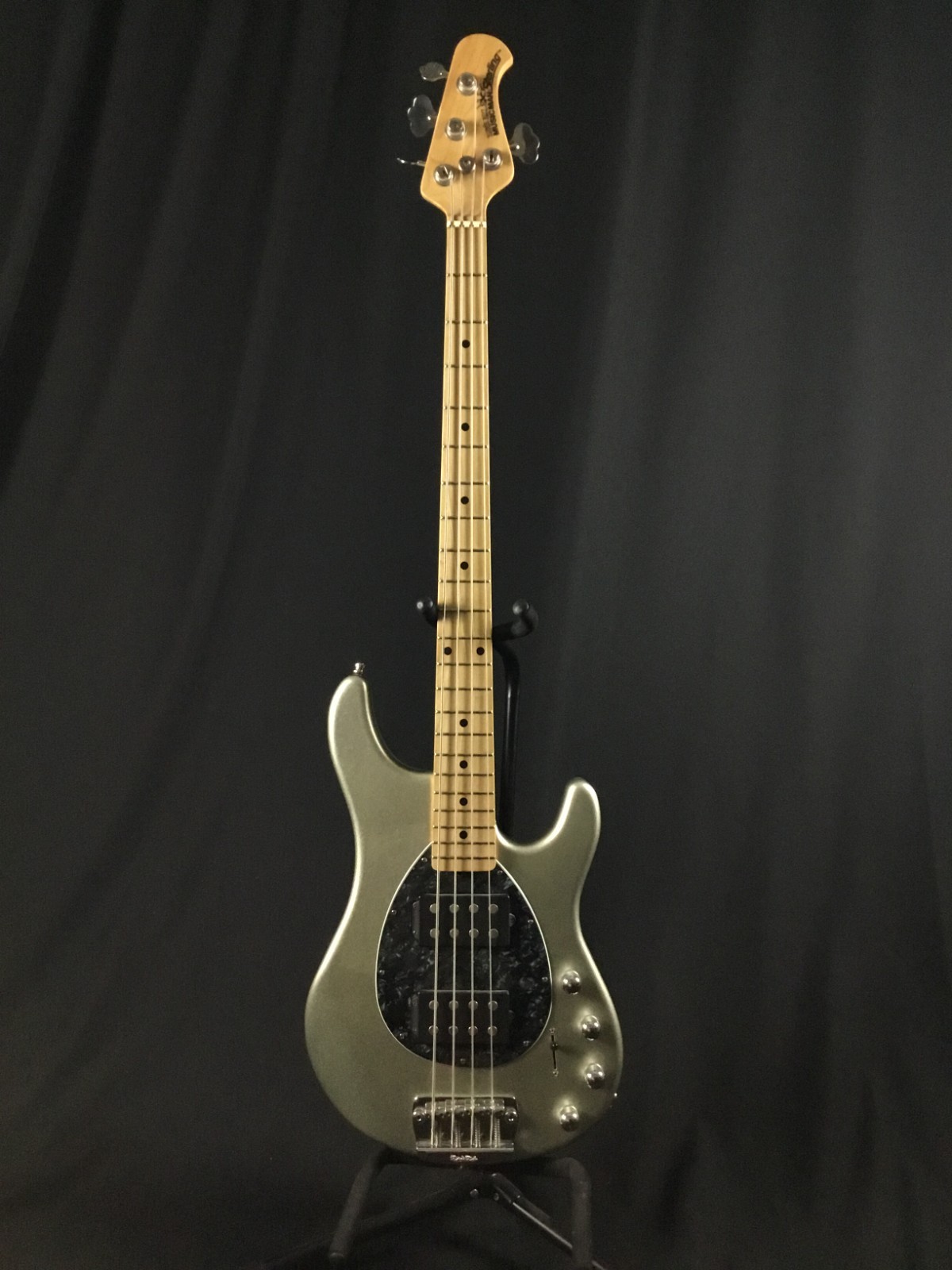 This is a used guitar in good condition, sold as-is, as pictured. Previously owned bass in great playing condition. Ernie Ball Music Man, made in Dec. 2008. Maple neck and fretboard, chrome hardware, black perloid pickguard. From web description: Nine volt active 3 band EQ preamp, 3 position pickup selector switch, and a ceramic humbucker with hum canceling phantom coil come standard, equipping the Sterling to cut through any mix. The optional addition of a pickup in the neck position adds even more versatility