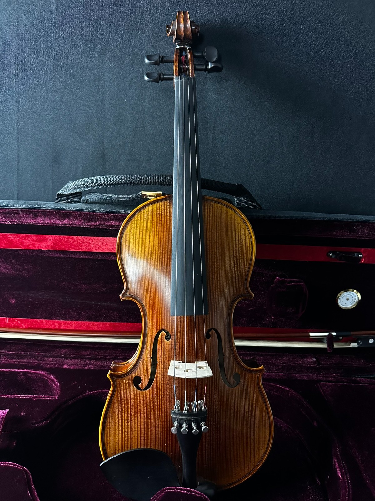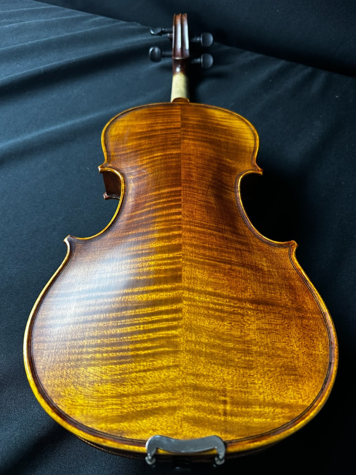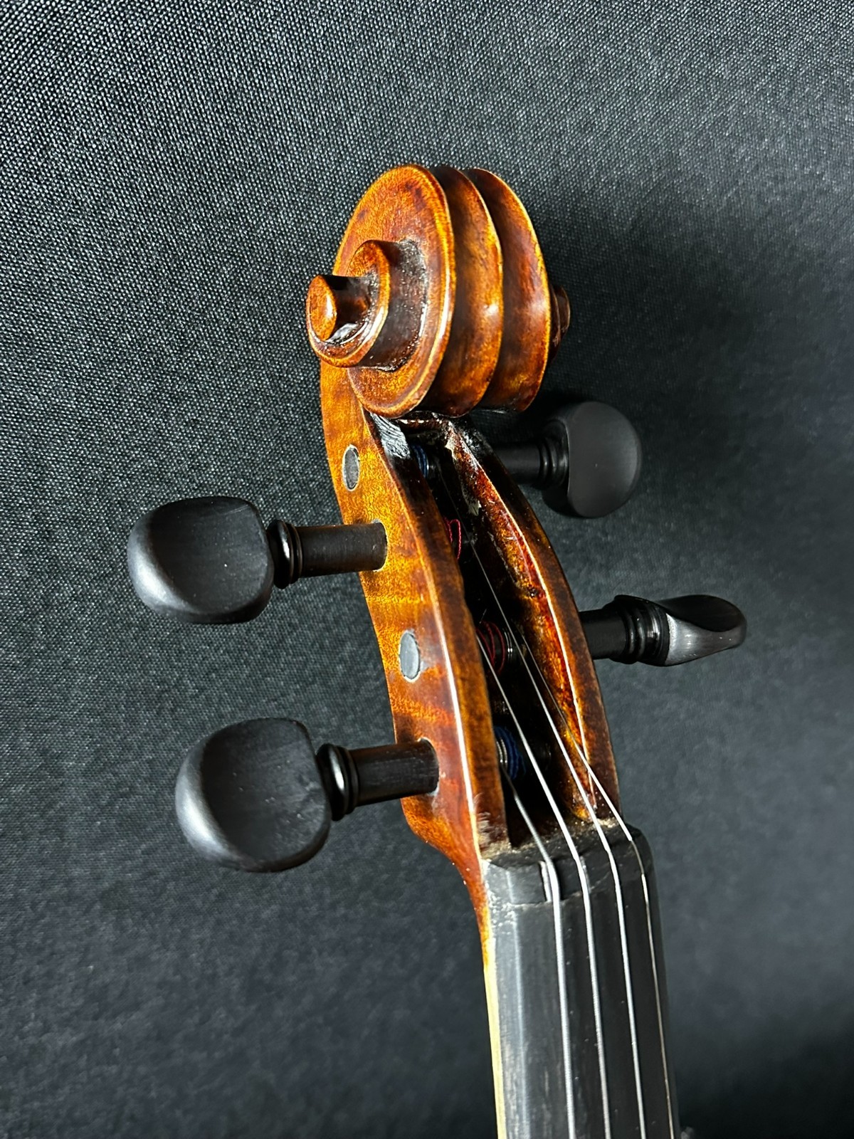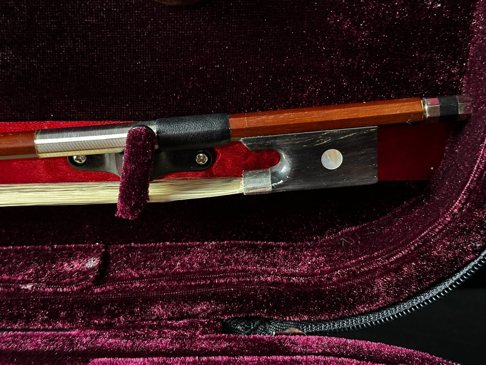 This is a used instrument in good condition, sold as pictured. Minimal wear and tear consistent with age and use. Includes case and bow. Lovely instrument with gorgeous flaming on the back and sides.